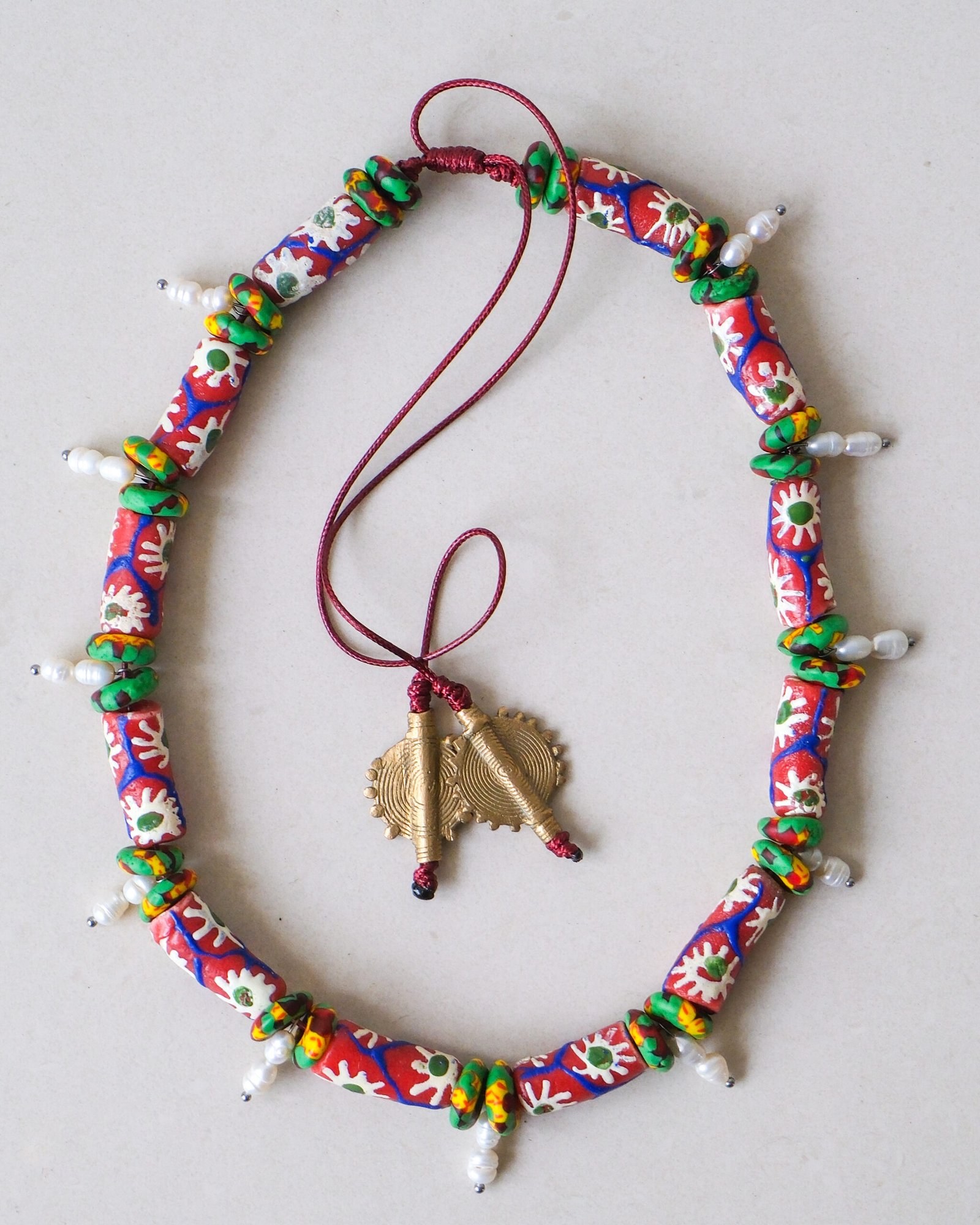 Un collier en perles recyclées, imaginé pour le quotidien, entre héritage artisanal et allure contemporaine.